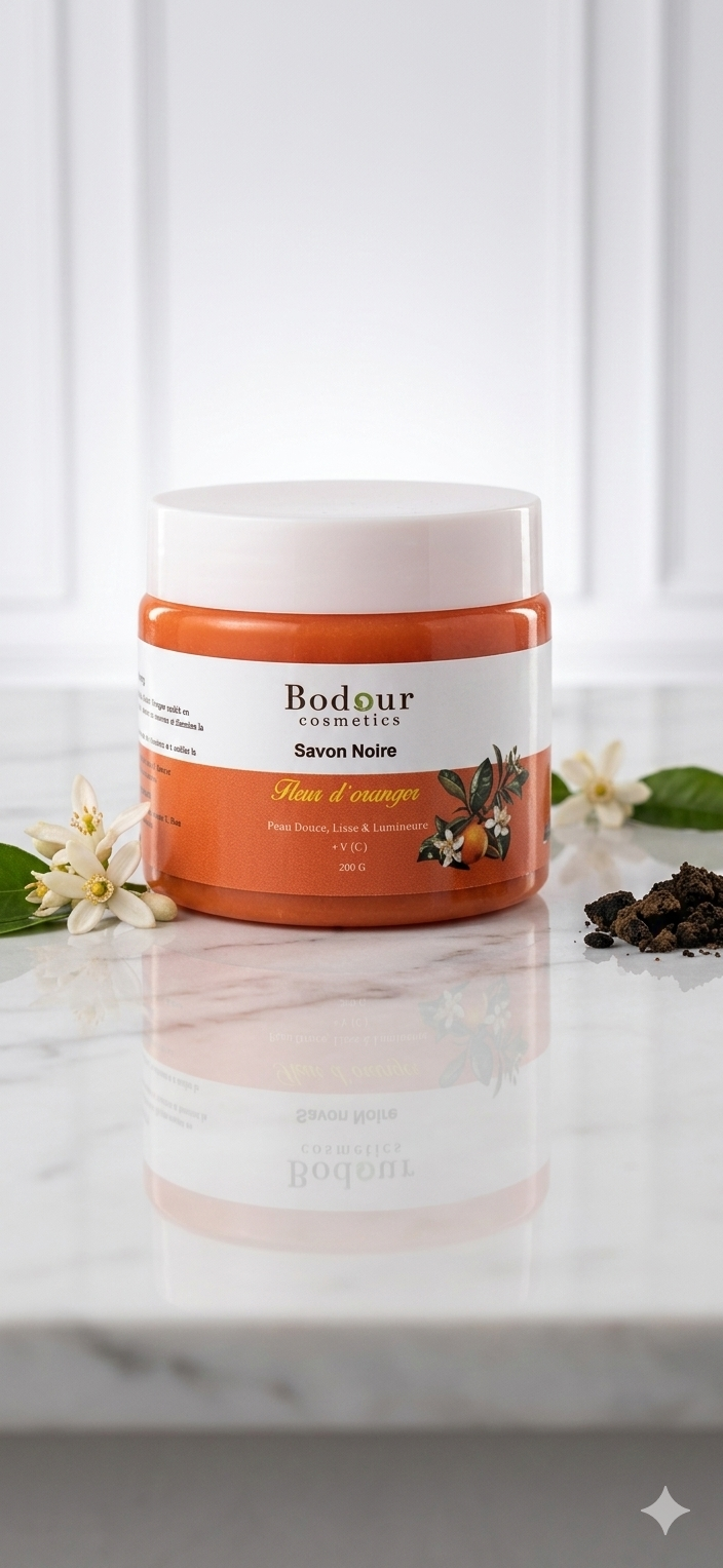 Savon noir à la fleur d’oranger pour une peau douce, parfumée et éclatante.
